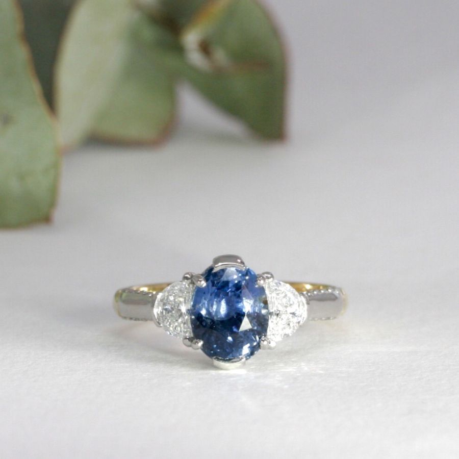 Twin Moons: 18ct Yellow Gold & Platinum Ring. Featuring 1 x 2.49ct Oval Blue Sappire. 2=.50ct F VVS Half Moon Diamonds , 4 x 1.3mm RBC Blue Sapphires & 46 x .005 F VS RBC‘Red Wine’